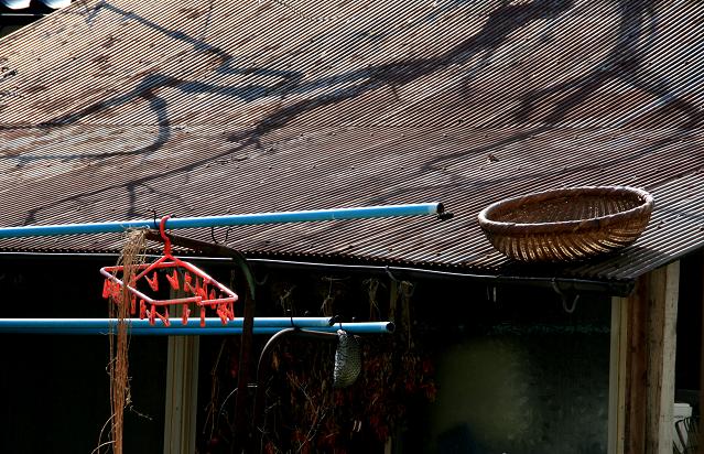 屋根の上のザル 柿の木が屋根の上を覆っている