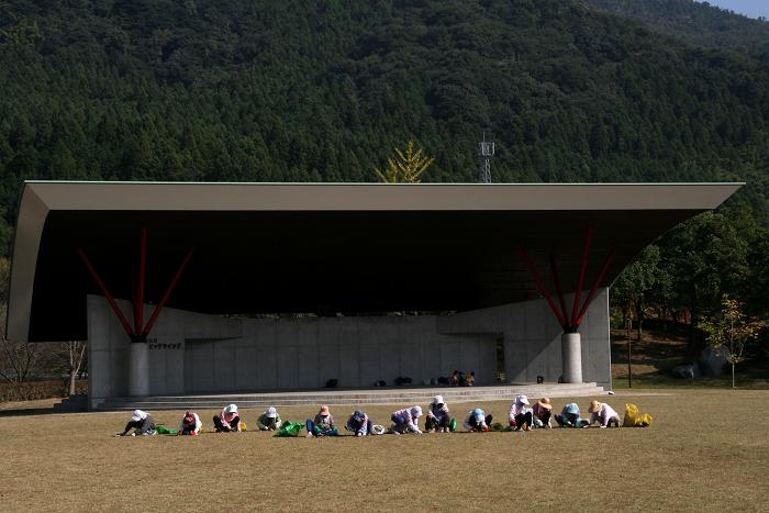 ダムのそばの公園。周りでは幼稚園児たちが遊んでいる。近所のおばちゃんたちが横並びになって草取りをしておられた。 おしゃべりしながら草取りは続くおばちゃんたちのおかげでこの公園はいつもよく整備されている。一度作ってしまうと後は無管理という公園が多い中、この公園はよく管理され、年中さまざまな行事が行われている。ありがとう、おばちゃんたち。