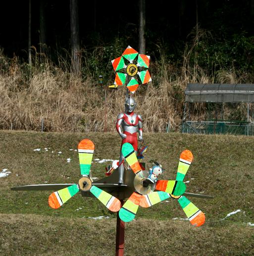 田んぼには雪が残っている。これから少しずつ田起こしからはじまる米作り。これをしっかりと見守るウルトラマンとドラえもん。粋なお百姓さんがいるものだ。創意工夫とみんなを楽しませるお百姓さんに感謝。