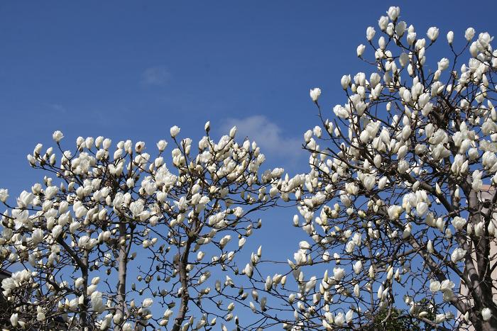 モクレンコブシはモクレン科なので当然似ている。 モクレンとコブシの違いはハクモクレンとの違いは,コブシの花の下には小さな葉っぱがついていることらしい。いずれにせよ、ハクモクレンは青空によく映える。