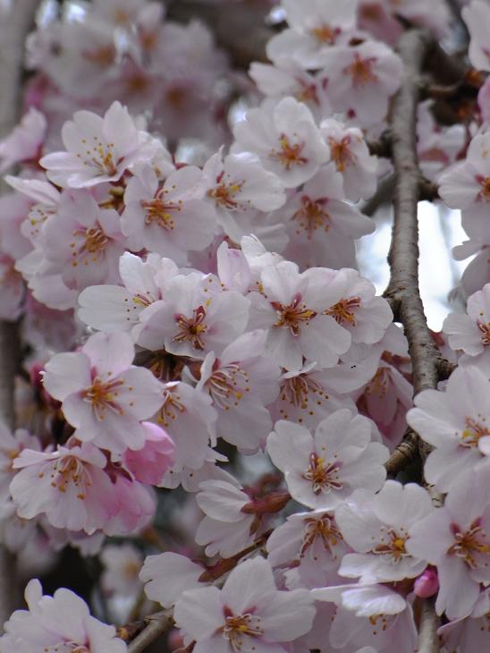 小ぶりな花をつける枝垂れ桜昨日からの暖かさで満開になった。ピンク色の小さな花も折り重なると迫力がある。隣にソメイヨシノも数輪咲き始めていた。こちらは白色で数輪では枝垂れ桜には対抗できない。