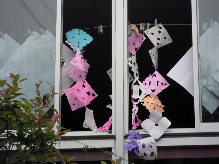 近所の幼稚園。七夕飾りの準備 ------------------------------------------突然の晴れ。気温はいっきょに上昇。教室に来てエアコンのスイッチを入れる。動かない。あれっと思って何度も繰り返す。電源を引っこ抜いてやりなおしても動かない。生徒が来るほうの部屋はエアコンが効く。事務をするほうが動かない。仕方なしに窓を開けて扇風機で我慢。