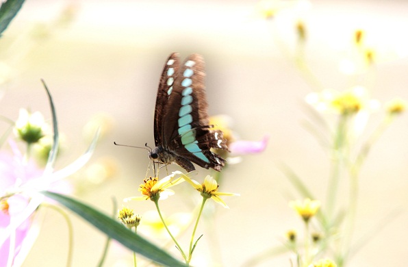 It's a calm autumn day. A butterfly is sucking up the nectar of a flower.Its blue wings are dazzling in the strong sunlight.