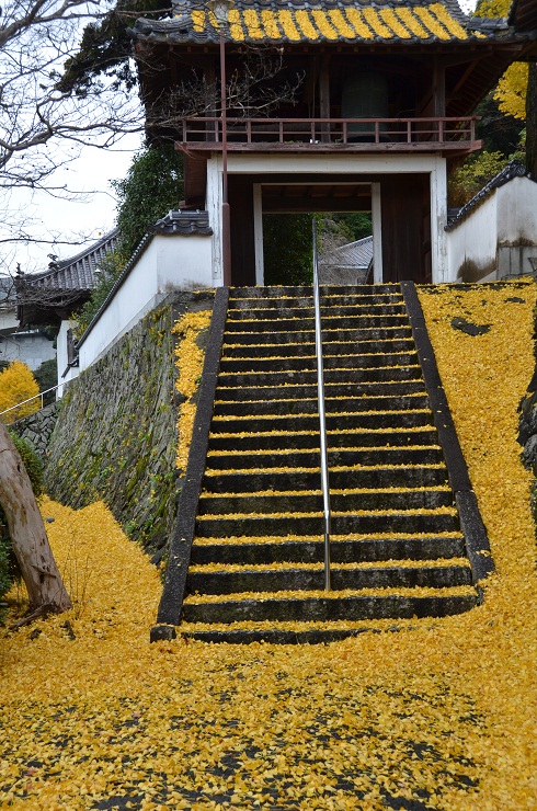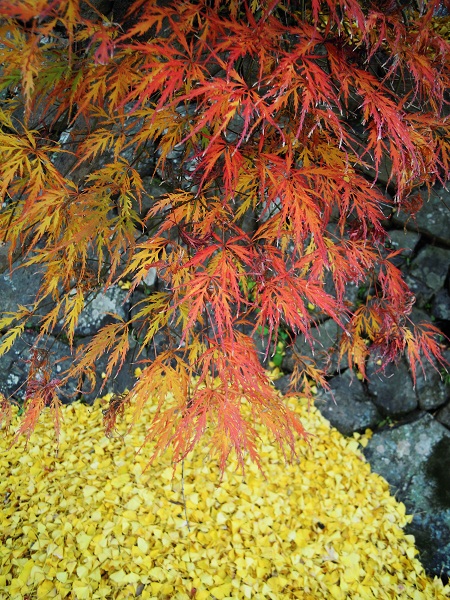 昨夜から今朝にかけての雨と風でイチョウの葉が一斉に落ちた。市しての重要文化財の大イチョウの葉だけに落ちた量も尋常ではない。