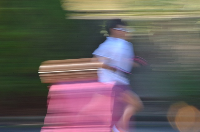 Runners in the park This is the good season for running.Many athletes are practicing around the park.