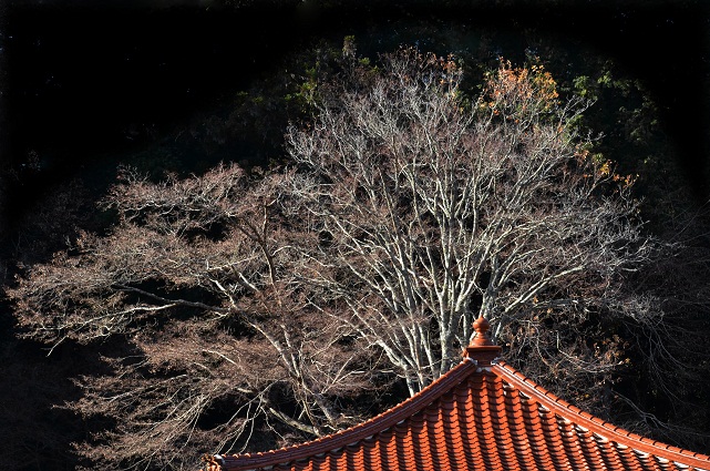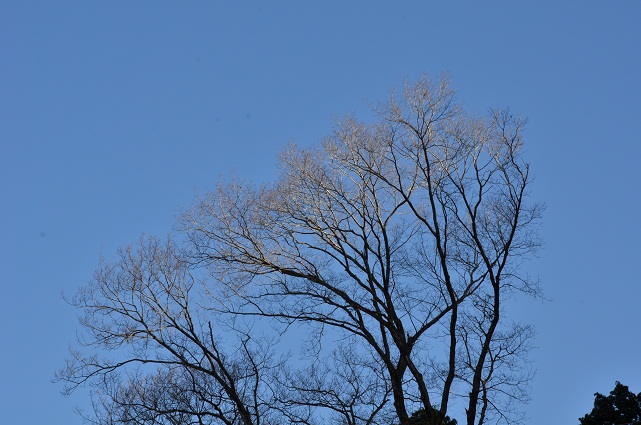 秋を鮮やかに飾ったモミジ。葉をほとんど落として枝だけが残照に映る。今朝も気温は氷点下。厳しく冷える。