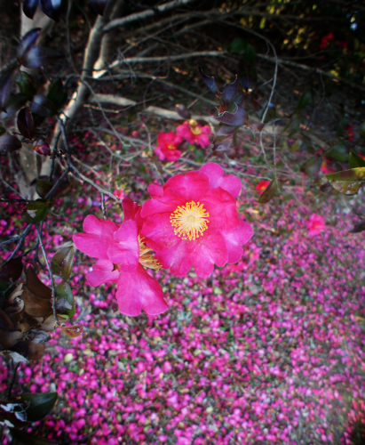 花のない時期に咲くサザンカ 今の時期は本当に花がない。そのためか一層寒さが身に染みる。サザンカのピンク色で少し救われる。