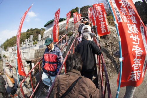 1月17日は川崎観音の今年最初の祈祷のある日。安産と健康への祈りをするために大勢の人が押し寄せた。 ここは特に安産の祈祷で有名な観音様。子供を授かった母親がおっぱいの形をした飾りを奉納する。1年後無事子供を授かるとお礼にお参りする。