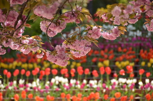 春の景色チューリップも満開。5月の連休を待たずに全部散っていきそうだ。つつじも開花し始めている。季節を先取りして花は咲いていく。