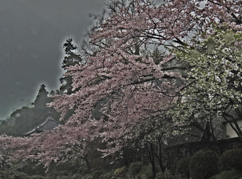 雨に煙る桜もいい 桜が満開になって今日の強い雨に打たれている。まだ満開になったばかりの花は頑張って咲き続けている。地面が花びらで埋め尽くされるのもまたいい。枕草子の「いとをかし」という情景になる。