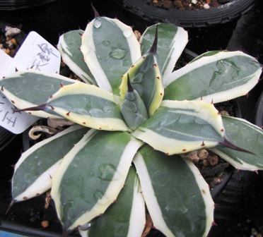 ☆アガベの中小型種と斑入り種について☆王妃吉祥天錦吉祥天の小型ダルマタイプの複輪斑入り種--3号鉢植え☆五色万代---奇麗な斑入り種、かなり大きくなる黄白色の複輪斑に葉の縁が赤く色ずき中縞の斑も入る☆吉祥冠中斑黄白色の薄縞斑、こちらもかなり大きくなる☆アガベ ナンバーワン(農大厳竜)のダルマタイプ葉に厚みがあってプックリしていて、葉先の肉刺が強烈な良品種。☆王妃雷神= 雷神の短丸厚葉の姫性種5~6cmで子吹きしてくる、繁殖旺盛なコンパクト品種。xxxxxxxxxxxxxxxxxxxxxxxxx☆これからの夏場は、やっぱりアガベとアロエが似合そうです、中小型種に斑入り種は存在感があって、酷暑期に和ませてくれると思います---。応援お願いしますにほんブログ村ブログランキング★ガーデニング