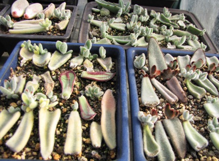 ☆エケベリア、セダムにクラプトペタルム・カランコエ等の葉挿し増殖について。☆カランコエ月兎耳類葉の途中からも芽出し可能なので大きい葉は、2つに折っている。☆挿し穂する際の下葉をもぎとったのを蒔いてある玉葉、虹の玉、姫秀麗等、手前2鉢はエケの花茎の葉です。☆芽と根が出て鉢いっぱいになった状態、クラッスラの紅稚児と天傘も育っている。☆エケベリア 花いかだと古紫、一度葉を取って植替えしてある大きいものから、順に鉢に植え付け(空いているのは鉢上げのためにぬいた為)。☆アドロミツクス クーペリー順に大きいものから鉢あげしている。-------------☆葉が取れやすい種類ほど葉挿しがし易いようですパキベリアの桃美人や紫麗殿も、し易いです----。****************応援お願いしますにほんブログ村ブログランキング★ガーデニング