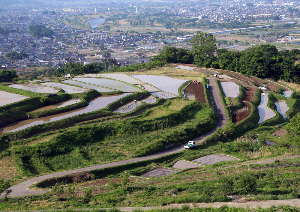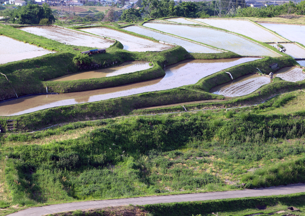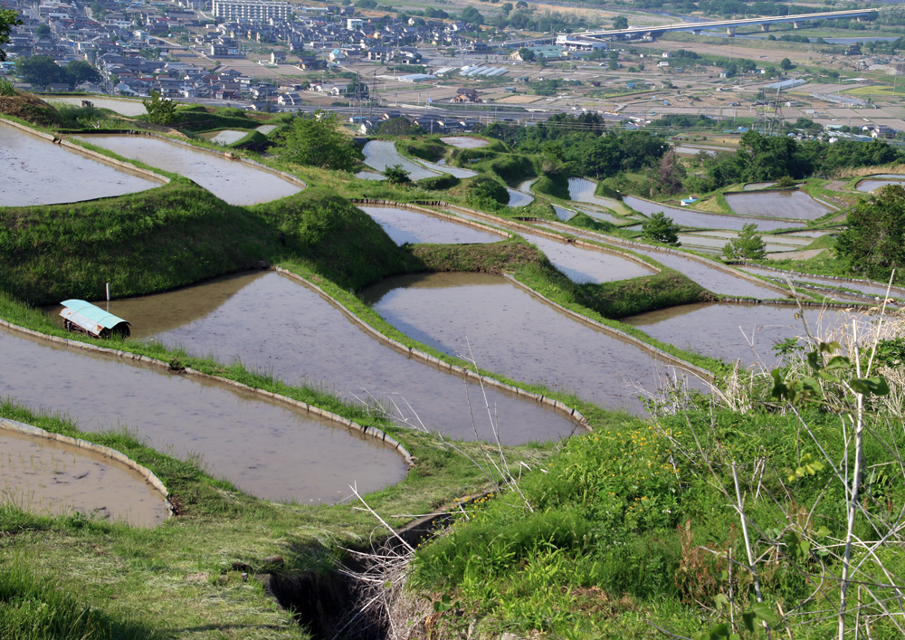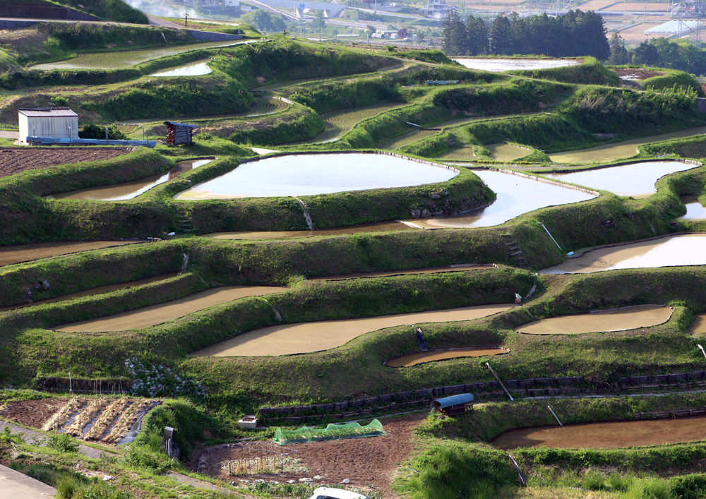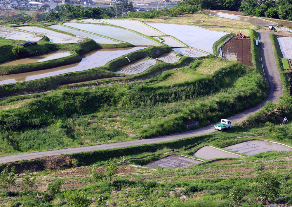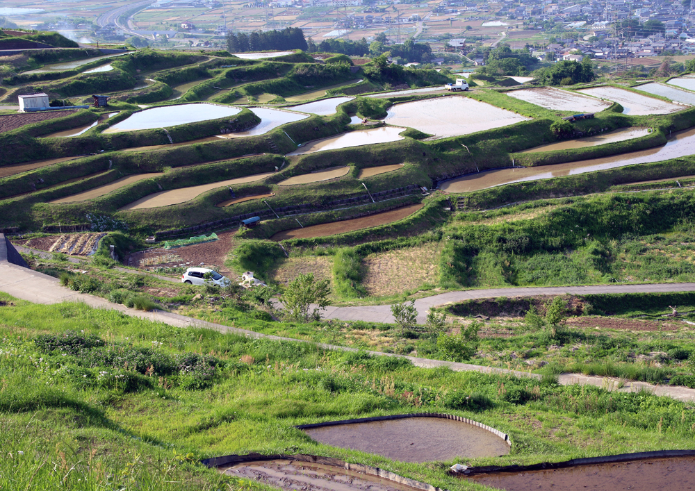 「田毎(たごと)の月」は、棚田に映る月が美しく見られる場所として知られている。
