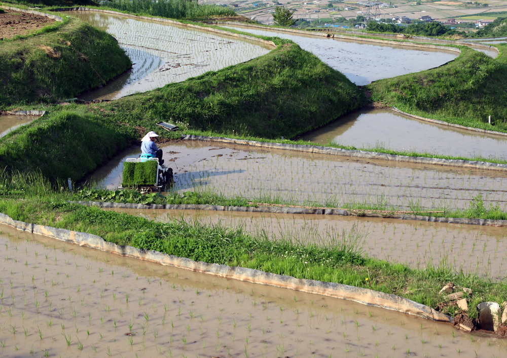 運よく棚田に水が入いり田植えの真っ最中に出くわす。