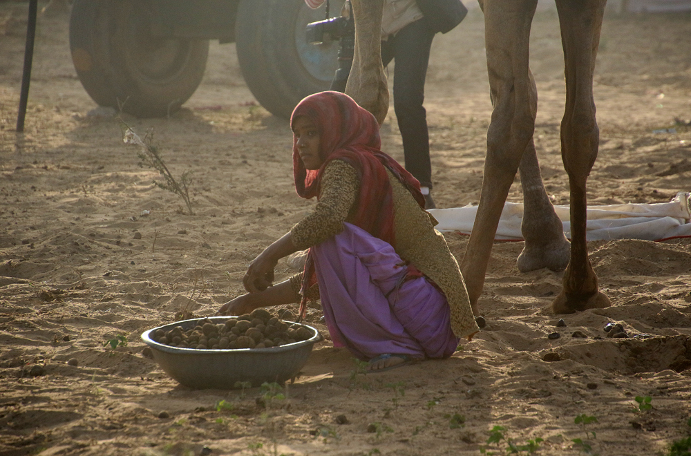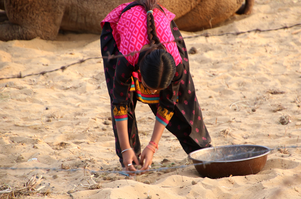 牛の糞同様に駱駝の糞は貴重な砂漠での燃料だ。オシャレをした若い女性が運ぶ姿が