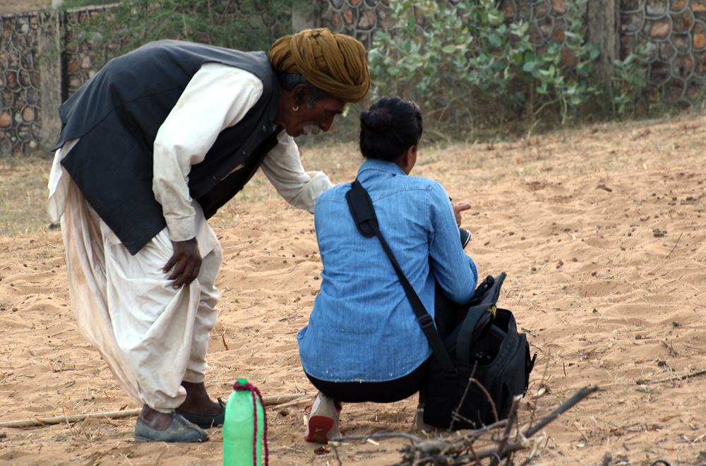 欧米の女性カメラマンが撮った写真を見るために、覗き込んでいる