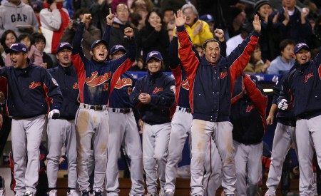今日は日本×韓国がありました。。結果は韓国の3番李(今年から巨人)が、日本左腕の守護神・石井から右翼に逆転2ラン!!最終回、日本はイチローが遊飛でゲームセット。。日本は、松中の執念の2塁タイムリー内野安打と川崎の右翼ホームランで2点を先制。。他にも2、3塁の場面で送球が少し逸れたものの、タイミングは確実にアウトだったイチローのレーザービームなど、いろいろな見所があった韓国戦。。でもその中でも印象に残ったのは、2アウト満塁 打者西岡の場面。。西岡の打球は右翼のややファウルゾーン気味の打球。。抜ければ走者一掃でこの試合を決定付けるとも言える打球・・・・しかし!!韓国の右翼・李晋暎がダイビングキャッチ!!!!あれはヤバイほど上手かった。。めっちゃ見入った。。あのプレーは中々出来ないと思う。。イチローのレーザービームや李の逆転2ランがあった中、一際目立ったプレー。。僕は今日のヒーローは逆転2ランを放った李ではなく、李晋暎だと思います。。やはり今回の韓国の勝因は投手陣の好投と李晋暎の好守ではないでしょうか?あの好守で流れが一気に変わった気がします。今回日本は2勝1敗で2回戦進出ということですが、頑張ってアメリカやキューバ、ドミニカなど強豪のチームに頑張って欲しいです。。