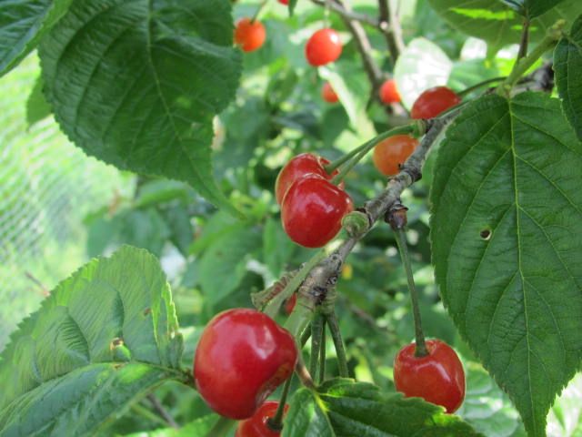 今年は少し遅くなりましたが、いよいよさくらんぼの収穫です。先日雨が降ったので、割れてしまった実もあります。そうは言うものの、まずまずの出来ですよ。防鳥ネットはそろそろ外さなければいけません。毛虫など、葉っぱを喰う虫を鳥たちに食べてもらうためです。
