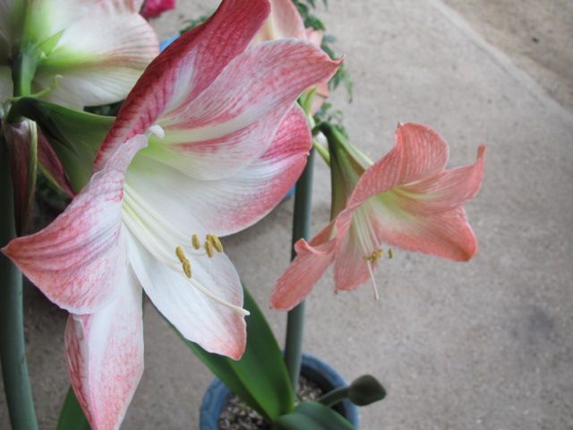 今年は2鉢になったアマリリスが仲良く一緒に開花しました。初めは一つの球根だったものですが、花の色がちょっと違います。土の違いか、植え替え時期の違いか…。去年は1鉢に花が3つ着きましたが、今年は2つに減りました。でも、画面の下に矢印みたいなものが出ているのがわかりますか。もう1本蕾が伸びてきていますよ。