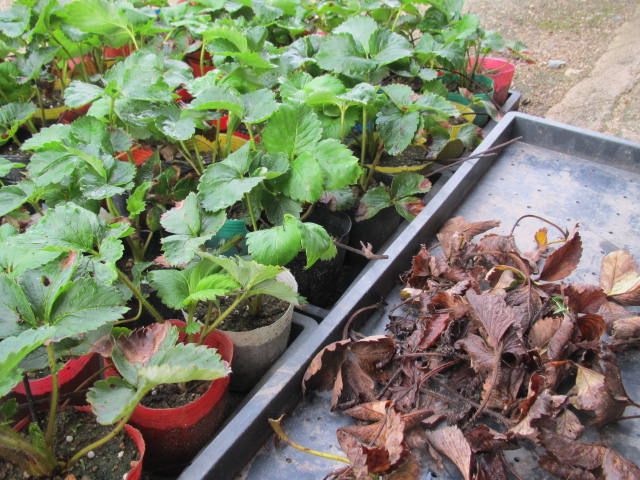 イチゴの苗はいつもは放任栽培ですが、今年はポリポットで育てることにしました。先日には追肥もしたので、葉っぱが茂り、株も大きくなっています。時々枯れた葉っぱを取り除きながら、植え付けまで管理を続けます。今のところ、90株確保できました。