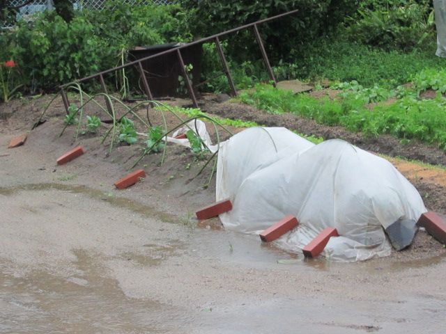 植え付けからちょうど2週間が経ち、芽キャベツも少し大きくなりました。しかし、台風が迫っています。防虫目的で不織布で覆っていますが、それだけでは不安です。というわけで、土寄せをしておきました。1株だけですが、葉っぱが変です。病気?虫ではなさそうです。