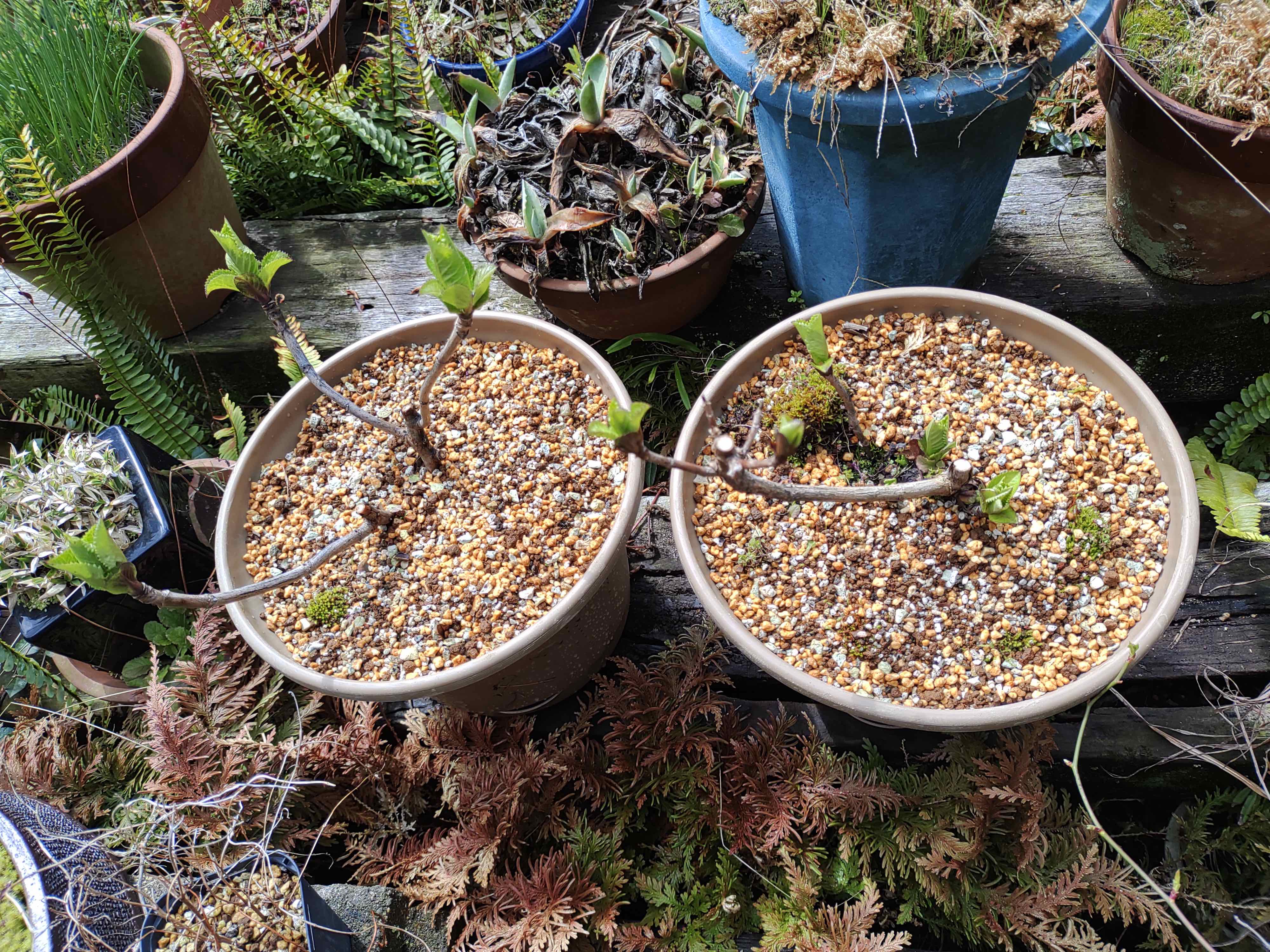 今のところ、アジサイが4株あります。すべて底面給水鉢で育てています。でも、小さめの植木鉢の株は芳しくありません。水分が必要な植物は、ある程度大きめの植木鉢がいいのかも知れませんね。今回はひと回り大きな底面給水鉢に植え替えました。こちらは植え替えなかった株です。新芽がたくさん出ています。やはり大きい植木鉢に植え付けてあるからでしょう。今シーズンはこのまま様子を見ます。