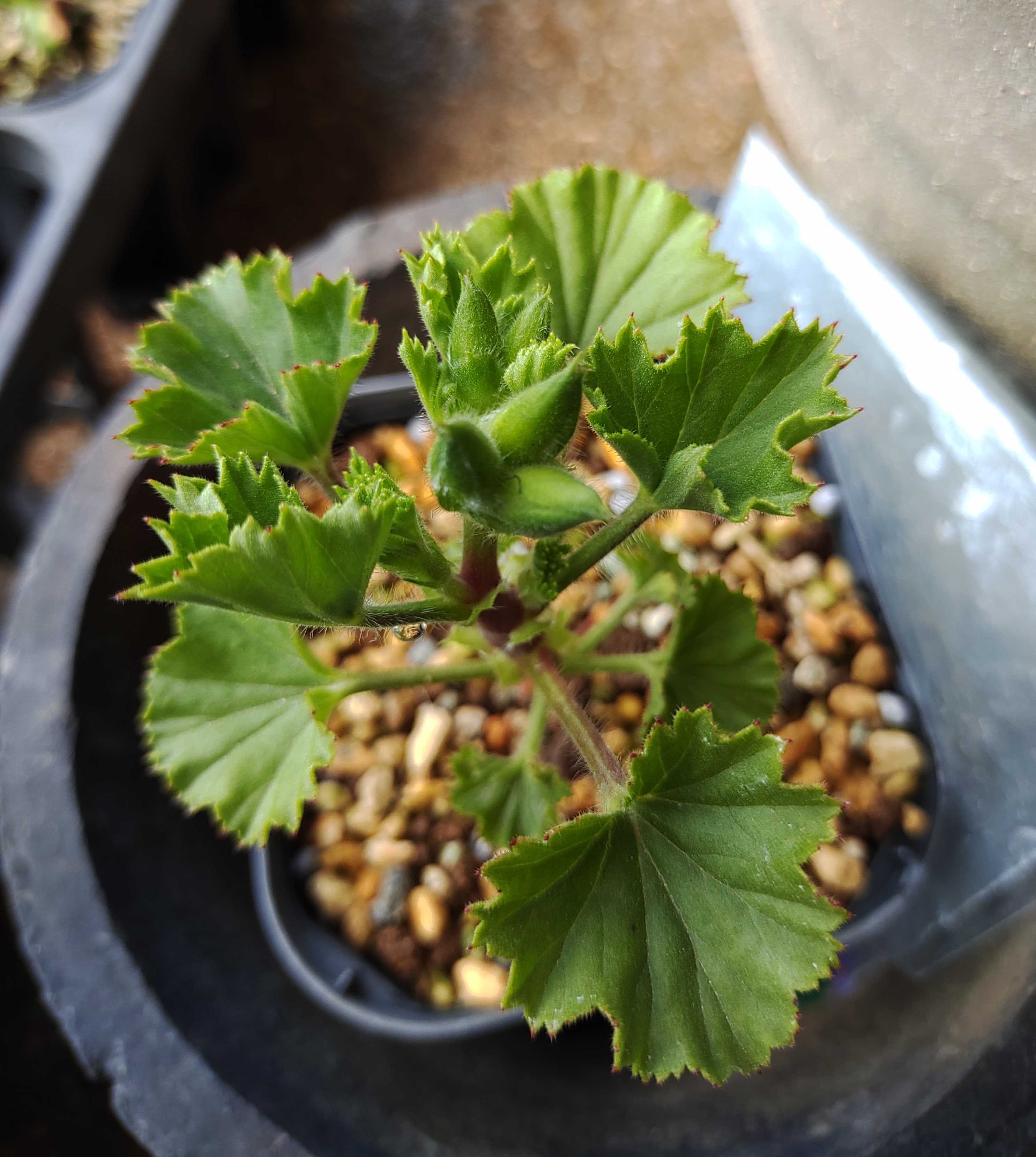 去年の夏に急に枯れ始めたゼラニウムを救うべく、緊急に挿し芽をしたのは8月下旬です。梅雨明けからの長雨で根腐れを起こしてしまったのでしょう。挿し穂も次々と枯れ、唯一生き残った挿し穂がこちらです。一時は全滅も覚悟しました。寒さが堪えないように鉢を二重にしたり、穴を開けたビニール袋を被せたり…。復活を信じて、根気強く育ててきました。なんと、中心部につぼみが着いているではないですか。もう大丈夫でしょう。