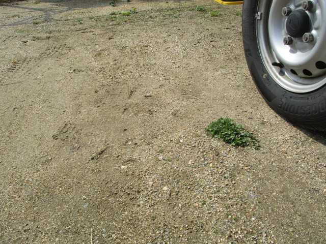 カチカチの土がむき出しのうちの庭です。雑草が生えにくいのはいいのですが、乾くと土煙が舞って困ります。去年の夏、育苗トレイで育てたクローバーを何ヶ所かに植え付けましたが、今はこんな状態です。大きなスコップで深く掘ってみましたが、とにかく硬い!粘土質の土の下に真砂土のようなカチカチの土の層があり、これでは植物は育ちません。去年は植え付け方が浅かったようです。