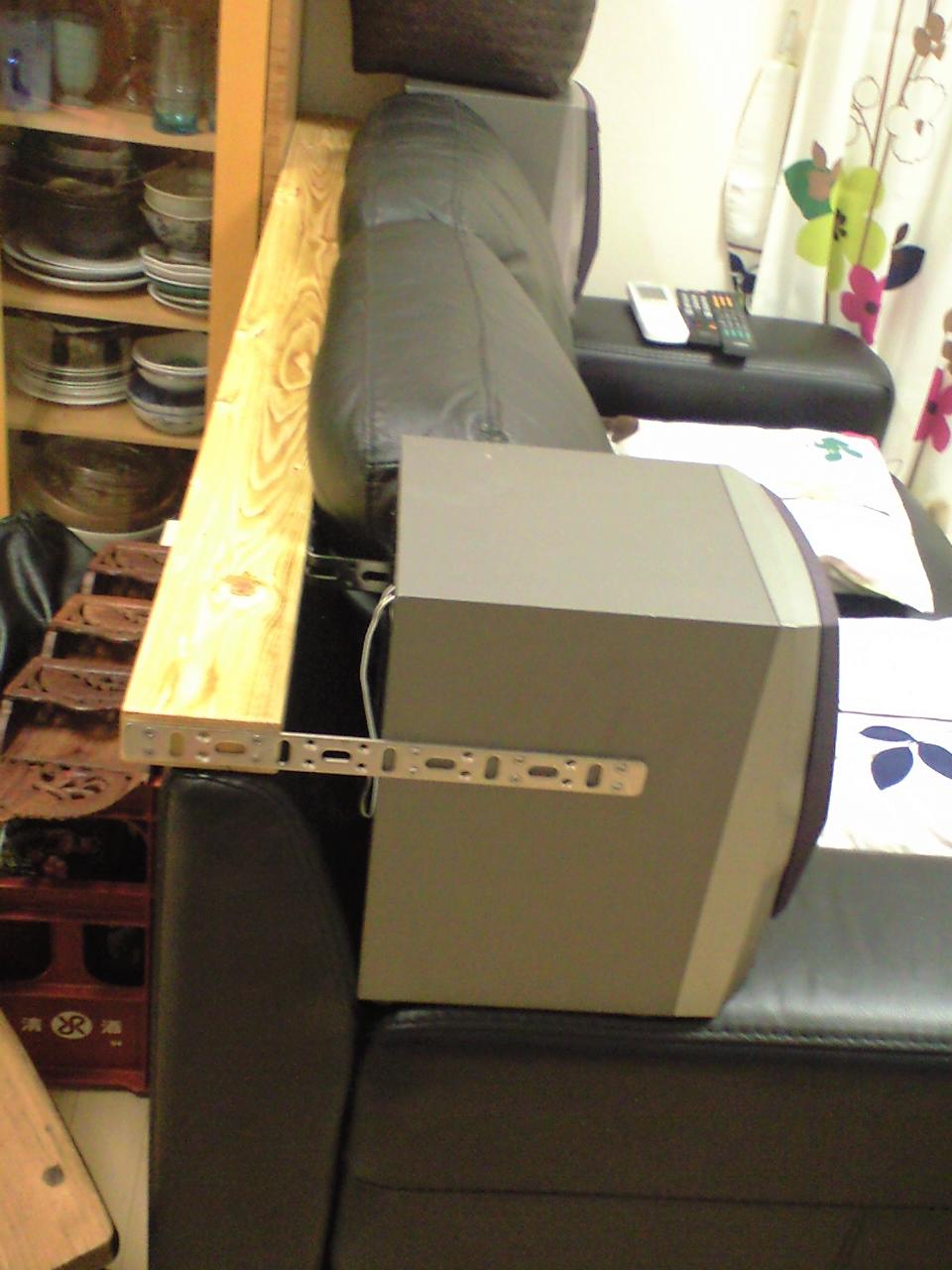 前に住んでた家で使っていた壁掛け型の扇風機。まだ買ってそんなに経ってはいなかったので、新居に移っても捨てずにしまってあった。諸々の事情で取り付けずに放置プレイ中だったが、今夏の暑さには流石に参ったし、普段自分達が使っている扇風機は『サーキュレーター』と呼ばれるタイプのもので、【30台限定】赤字覚悟の大特価セール!1ヶ月半で200台突破の大人気商品です!ツインバード(TWINBIRD) フロア型サーキュレーター KJ-4071GYベッドの寝室では、エアコンを使わない時は風がベッドに遮られて全く涼しくない!それにもうじき嫁さんと子供が“帰国”(←くどい?w)するので、もう一台扇風機が欲しいところだが、地元の大型家電店やホムセンの扇風機コーナーはことごとく、キレイさっぱり品切れ中。聞いた話では、今年は7月の時点で欠品続出だったとか・・・。しかし、やっぱり壁に穴を開けたく無いので、据え置き型として使えるように土台を作ってみた。買ってきた材料はパイン材板(18x30x910)とL字の棚受け金具2本。板は切るのが面倒だったので、店でカットしてもらいました。文字通り3枚に・・・。w材料費は締めて1500円少々。板がちょっと高かったかな・・・?wで、さくっと組み上げ終了~♪もうね、面取りとか塗装とか、何もせずにただ素組みしただけ。w表側に買って来た金具を使い、裏には手持ちの別の金具をもう一本追加し転倒防止。板の裏数箇所に、昔百均で買ったクッション材を貼ってあります。そのうち気が向いたら、面取り&塗装をするかもしれません。(^∀^;