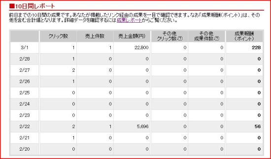 あっという間に2月が終わってしまいましたねでも、2011年は私にとっては結構実りのあるスタートだなーと感じています。今年になって新しく始めたもの。まず、断捨離これは未だに継続中です。それから、かき集めた不用品を活かしての、断捨離オークションこれで、今年に入ってから4万近く稼いでいます今日も3つ落札されました。そのご報告は、また明日あとは、2月になってから始めたもの。この楽天ブログと、アフィリエイト実はアフィリって、3年くらい前にも一度興味を持った時期があってその時もA8とかに登録はしたんですけど、どうにも続かなくて、すぐに挫折した経過があるんですよねでも、今回は「腰を据えてがんばるぞ!」と決めて始めましたそして、始めてからそろそろ1ヶ月なんですけど、今のところ成果はこんな感じです。 ビミョーに、本当にビミョーにですが、クリックがありますそして、これまたビミョーにですが、成果が発生しています56+228で、284ポイントですたった284ポイントとか言わないでください!これだけでも、始めての成果で私的にはすっごく嬉しいんですからでも、まだ確定していないから、破棄される可能性もあるんだけど、なんとか確定してもらいたいものですこないだ、古本屋でアフィリの本を一冊買っちゃったので、せめてその金額分だけでも、回収したいですちなみに買った本は、これ【中古】afb【古本】アフィリエイトで手堅く月5万円稼ぐ50のコツ ホ-ムペ-ジがあなたの代わり...まあ、無難な本かな~と思ったので買ってみました。でも買ったからには、活用しますよ最近は色んなサイト見て、じわじわとアフィリの勉強をしています。奥が深いし、周りにアフィリやってる人が誰もいないのでかなり孤独な戦いになると思われます。今のところは、分からないことはYahoo!知恵袋で聞いたりしてます。できれば、ネットでアフィリ友達ができればいいんだけどなうーーん、友達、募集中です(笑) 【送料無料】売り上げを倍増させたアフィリエイト最新実践テクニック価格:1,470円(税込、送料別)