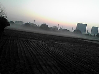 昨夜の雨でのせいで田から水蒸気が立ち上ってます。