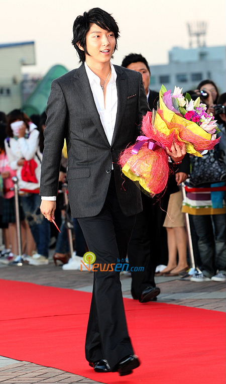 ファンがプレゼントした花束を手にレッドカーペットを歩くジュンギ