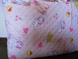 実は娘、今日から保育園に通っています。といっても一時保育ですが来週からは週2~3回ペースで通います。今日は慣らし保育の為、午前中のみの登園でした。手続きなどもあり、9:00の登園時間より少し早く行き、30分くらいは私も園に一緒にいました。そして、様子を見ながら帰ろうとしたその時、先生の腕の中で暴れだし、すごい勢いで泣き始めたのですが、娘に「お昼にはお迎えに来るからね」と説明し、さっさとお部屋を出てきました。正午になって、ひいおばぁちゃんと一緒にお迎えに行くと、お部屋の中で先生やお友達と楽しそうに遊んでいて、私達が迎えに来ているのに気づくと、足をバタバタさせて喜んでいました。泣いていたのも最初の30分くらいだったみたいだし、なんとか大丈夫そう。今日もお天気が良かったので、午前中は大好きなプールにも入れたみたいです^^ こちらに居るのも8月の上旬までなので、保育園へ登園するのも数える程度しかありませんが、保育園で必要となるものを前日までに全部揃え、一つ一つに名前を書いたりと昨夜はバタバタでした。新しく購入したお昼ね布団はマリーの絵柄でとっても気に入ったらしく、保育園がない日もおうちで使っているほどです。 thank you!!