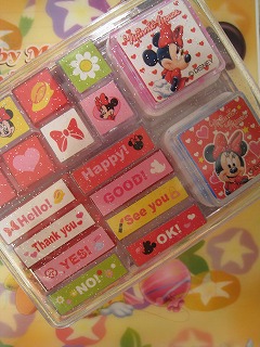 今日は私の友人が家に遊びに来てくれました。彼女と最後に会っ たのはちょうど一年前の今頃。去年は娘の1歳の誕生日パーティ ーを屋形船を貸しきって行いました。その時に彼女もお祝いに来 てくれ、あれから一年… あっという間に経ってしまいました。子 供が生まれてから、すべて子供中心の生活になってしまい、独身 の頃からの友人とは会う機会が本当に減ってしまいました。私の 場合、娘も一緒に出かけなければならないので、独身のお友達 ですと振り回すことになってしまうので、なかなかこちらからはお 誘いしにくいのが現状… しかし、今日遊びに来てくれた彼女は 甥っ子さんが2人も近くにいて、すごく子供なれしている為、娘も すぐに彼女になついてしまいました。そんな彼女はいつも娘に気 の利いたプレゼントを持ってきてくれます。今日頂いたのは娘の 大好きなミニーのバックとノート、それからスタンプセット。それは それは大喜びでした。スタンプを使うのは初めてのことでしたが、 嬉しそうに「ぺったんこぺったんこ」と言いながら遊んでいました。 娘は主人も驚くほど私の友人を気に入ったらしく、彼女の膝の上 に乗ってずっと遊んでいました。久しぶりに会うことができ、私もと ても楽しい一日が過ごせよかったです。 thank you!!