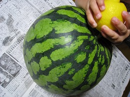 おばぁちゃんの畑でできたスイカ。すごいでしょ~ ここ最近、収穫の時期を迎えています^^分かりますか~?この大きさ!!かなーり大きいです。娘も「甘~い!おいちー!!」と大喜びです。今日は保育園の帰り道、娘とおばぁちゃんの畑によって、なすとトマトをとってきました。スイカもまだまだ3つくらいは残っているので、大きくなるのが楽しみです。200円ちょっとの苗でこんなになるとは思っていなかったようで、元が取れるわ~と喜んでいる我が家です。。。^^; thank you!!