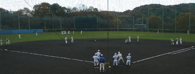 昨日の嵐の様な天気から一変…超快晴vv今日のメニュー…今日から秋の大会。夕方から恵比寿でLIVEだったのでどうせならと朝から神宮第二球場へ。到着したのが10時半前…既に二回が終わっていました。うわ… 1-2で帝京八王子がリードしてる!!初回何が起こったの?(笑)(帝八3番打者の2ランホームランだったそうです。vv)帝京先発大田君。帝京八王子先発小室君。3回表。帝京の攻撃。打順はちょうど1番から。1 本間君(8) センター前ヒット。2 上原君(4) ライトフライ。3 杉谷(拳)君(6) 大きなセンターオーバーの3塁打。 2-2 4 中村君(3)ライト前ヒット。 3-2 もう…逆転…(笑)。5 永妻君(12)死球6 高津君(7)ライトフライ7 高本君(20)レフトフライこれは…ガンガン打ち込まれるかな?と思いましたが案外下位打線は淡泊に終わりました。裏。帝京八王子。帝京高校はみんな凄く大きな子ばっかりな印象だったので相手チーム見劣りするんだろうなぁなんて勝手に思っていたら…大間違い!! 帝八…凄い大きな子が多かった。(細い子も居たけど。。)体格では負けていませんでした。(笑)特に主軸を打つ3,4,5番打者は別格。帝八打順3番から先頭打者四球で出塁。次打者三振↓↓。5 田中君 バントでしたが二殺。6 ? 君 二邪飛でしたがセカンド上原君のエラーで内野安打に。7 ? 君 セカンドゴロ。大田君あまり制球が定まっていないようでした。4回帝京。8 杉谷(兄)君 (9) 四球9 大田君 (1) バント…先程のバントで二殺されたので今度はやり返されました。(笑)その後セカンドゴロ、四球、三振でチェンジ。本間君は上原君の打席時軽く二盗していました。杉谷君…顔治ったのかな?打席に入る前三高の佐藤君みたいにバットグルグルやってました。(笑)裏帝八。いきなりセンター前にもの凄いライナー!誰だ?と思ったらピッチャーの小室君でした。。しかし…先頭打者が塁に出たのに…バント決めた後ラッキーな内野安打でランナー1.3塁。。。これは得点のチャンス!と思ったのに続く2,3番が連続三振。。。大田君頑張りましたvv5回帝京。4 中村君 セカンドゴロ。 中村君は甲子園でも出ていた好打者だとか。。今日はいまいち。5 永妻君 あっと驚く様なライトポール際ギリギリのホームランvv 4-26 高津君 四球7 高本君 四球…… 小室君さっきのホームランから調子が変? ストライク入らなくなっちゃった。。。 ここでピッチャー交代。背番号10番の浅見君に。8 杉谷君 この打席は右に入りました。セカンドゴロ…二殺されてランナー1,3塁。9 大田君 杉谷君二盗。ショートゴロ。。。 変わった浅見君抑えました。裏帝八。打順は4番から。 レフトフライ。5 センター前ヒット。6 バントを試みてるとバッテリーミス!!この間に走者田中君三塁に。 又チャンス!! が…スリーバント失敗で三振。。。三塁田中君飛び出していて挟まれてアウト。。。帝八…あと少しなんだけどホームが遠いです。6回帝京。1 本間君 三振!2 上原君 何でもない内野フライ…を帝八ショートが落としてしまい安打に。3 杉谷君 走者二盗。杉谷君は1ゴロ。。4 中村君 レフトヒットvv 5-2 5 永妻君 またまた走者中村君二盗。 さっきのライナーのホームランの後…センターに抜ける二塁打!! 6-2 しかし…そこまで広くない神宮第二…センター君。。。足遅いよ。。(汗)6 高津君 またまた永妻君3盗。ショートゴロでチェンジ。この回だけで盗塁3つ。。さすがだね。裏帝八。ライトフライ、三振、内野ゴロ…打者3人で終わりました。7回帝京7番高本君から。。。一ゴロ→内野フライ→3ゴロ…こちらも打者3人で終了。浅見君も結構頑張ってました。裏帝八打順1番から。。。内野フライ→内野ゴロ→三振!!またまたアトリ君打者3人で終了。やっぱり彼の球は速いね。。コントロール良ければそうそう打て無さそう。8回帝京もっと早くにコールドかな?とか思ってましたが浅見君が思いの外調子良さそうで帝京打線いまいち元気有りません。。………ちょっと目を離していたら…いつの間にか満塁!!(笑)しかもノーアウト!!4 中村君 四球。。 押し出しだぁ。。 7-2 ここで帝京八王子ピッチャー交代。10・浅見君から11・今中君に。 まだ…ノーアウト満塁なんだよ。。。5 永妻君 ライトフライ6 高津君 ショートゴロ 6、2,5でツーアウト。また満塁。。7 高本君 四球…またまた押し出し。。。 8-28 杉谷君 まだビッグチャンス!ってところでライトに打ち上げてチェンジ。。。 下位打線頑張れ。裏帝八思いがけないビッグイニングになってコールドかな?と思っていたのでよく抑えたねぇ。。でも打順主軸4番から遊ゴロ→ライトフライ→ライトフライ…大田君にまた打者3人で打ち取られました。9回帝京9 大田君 ショートゴロ1 本間君 内野フライ2 上原君 センターフライ帝八今中君も頑張りました。裏帝八 最後の回。。。打順7番から内野ゴロ→遊ゴロ→帝京捕逸 一塁→センター前ヒット→……三振!最後大田君渾身の投球。本日完投です。GAME SETほぼ…ユニフォーム一緒(笑) ストッキングがオレンジが帝京、黄色が帝京八王子。ユニの地