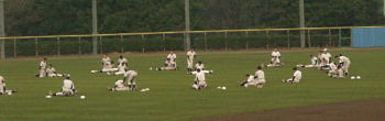 良い天気…風もあまり無くちょっと暖かかったvv今日は三年生の送別試合。毎年のことだけどちょっと寂しいです。9:00頃学校に到着。グラウンドに行くとみんなUPしてる。久しぶりに観た三年生達やっぱり髪が伸びると雰囲気違う…。そんな中…変わらないのが田中一徳君。(笑)( ̄▽ ̄)b 頭も前と変わらず…坊主だぁ!!今日も綺麗な三高グラウンド去年は三年と下級生とノックが別だったけど今日はいつも通り一緒。ノック前に監督から…久しぶりに観る池永君の二塁送球…やっぱり凄いわぁ。地を這うようにってあ~言うことなのね。笑顔の小倉監督…楽しそう。。でもね…ノックしてる監督凄くにこやかで観ているこっちも笑顔になってきたぁ。今日の主審は白窪コーチ。三年生先行で始まりvvあ~…よく見た光景だわ。。何回観たかなぁ。1,2年チーム…まだどれが誰なのかよく分からず。。。(/∇≦\)誰が先発だったの?(おぃ!笑)荒木君…相変わらずの痩身。笑” いきなりの二塁打に観客お~!と。二番誰?(殴!)分からない…最後なのに。。佐藤君四球の後、洋平君センター前ヒットで1-0。続く一徳君レフト前ヒット、池永君レフトフライでチェンジ。あ~…このメンバーの試合観るのって夏の決勝戦以来なんだなぁ。三年生先発は久松君。久松君も髪が伸びてマウンドにいても誰~?って感じで分からず。↓↓下級生チームのオーダーもはっきりと分からず終いで困ったぁ。1番の小林君三振、二番にセンター前にこれまた3塁打を打たれたぁ。。でもその後竹内君?、大川君を二ゴロ、Pライナーでとって抑えた。久松君…夏…二球で終わりだったねぇ。二回7番村橋君ライト前ヒットで二塁まで走る!8番大原君ショートゴロ、9番加藤君サードライナーで小林君取って三人で終了。裏。。。5番久松君暴投(笑)で一塁。6番又しても池永君後逸でランナー2塁。( ̄ー ̄?).....??アレ?? フライアウト。7番センター前ヒットで1.3塁。センター一徳君取れず悔しそう。笑8番黒崎君ライト前にヒットで1-1。9番内野ゴロでチェンジ。下級生チームもなかなかです。三回打順帰って荒木君四球。2番(松永君?)ライトフライ。3番佐藤君センターを抜ける二塁打!これで2-1。4番洋平君内野フライ。5番一徳君内野ゴロ…。今日佐藤君当たってるねぇ。裏。。。。。三年生ピッチャー交代。森君?1番小林君四球。2番ライトへの二塁打!加藤君取れず!3番死球…満塁だあ。4番大川君レフトへの二塁打! 2-3。ランナー2,3塁。(ここで三年生ピッチャー変わった?)5番 又しても久松君暴投…この間に3塁ランナー飛び出してしまい本塁アウトに。 ライトへの犠牲フライで2-4。6番四球、7番の時一塁ランナー牽制死。。。前回に後逸した池永君この回に二度刺してガッツポーズ!v(o ̄∇ ̄o)三塁側三年生ベンチ前…みんな元気だぁ。 4回下級生チームピッチャー交代…今度は左腕。(笑…だって名前が分からないんだもん。)6番池永君レフト前ヒット。7番大原君四球…1,2塁。8番村橋君ライトフライ。1,3塁。9番……あれ?観てなかった!?1番荒木君又も大きなセンターへの3塁打。4-4 ランナー3塁。2番?君ショートゴロ。荒木君本塁死で2アウトランナー1塁。3番佐藤君センター前ヒット。1,2塁。バッター洋平君…4番洋平君四球…2アウト満塁!!o(・∇・o)5番一徳君ピッチャー強襲の当たりvv この間にランナー二人返って6-4。1,2塁。6番池永君これ又大きなセンター越えの3塁打!8-4。3塁。7番大原君センター前ヒット。。9-4。1塁。……容赦ねぇ…笑”。8番村橋君…内野に打ち上げてやっとチェンジ。。。う~~ん…これがいつもの三高の野球だぁ!!ヽ(‘ ∇‘ )ノ この回7点の猛攻。。笑裏。。。。。。。三年生チーム…左腕に。村橋君だったの?( ̄ヘ ̄;)?7番レフトフライ。8番四球、9番四球、1番四球…ヽ(`□´)ノ笑”これは…わざと?笑”一気に満塁です。2番ライト前ヒット9-5。返球で小林君刺されて1,3塁。3番打者の時…一塁田代君?牽制死…。またまた冴え捲りの池永君! 元気そうだぁ。。5回下級生ピッチャー今度は右腕に。(笑)1番荒木君セカンドゴロ。2番?君ピッチャーゴロ。3番佐藤君ピッチャー強襲のライナー…が、ピッチャー一塁暴投で二塁まで走る。。笑4番洋平君…木製バットで登場vv が、セカンドゴロでチェンジ。。佐藤君凄く楽しそうに笑ってたねぇ。裏。。。。。。。。ピッチャー村橋君。3番レフト前ヒット。4番センター前ヒット。大川君調子良さそう。それにしても大川君…いい身体だなぁ。笑5番裕太郎君…池永君冴え捲って神憑り的(笑)。 1塁牽制死、3塁牽制死…。ちょっとぉ…頑張ろうよ。池永君刺しすぎ。。。笑裕太郎君結局四球。ランナー1塁。6番ショートへの内野フライ。7番ショートゴロ。。。荒木君大忙し。6回5番一徳君サード強襲のライナー。内野安打に。6番池永君三振!!7番加藤君二塁へのライナーで安打に。1,2塁。8番村橋君ショートへのゴロ。9番…の時セカンドの一徳君牽制死。。刺し返された!NICE黒崎君。裏。。。。。。。。ピッチャー一徳君に。で、、、、もうそろそろ終わりか