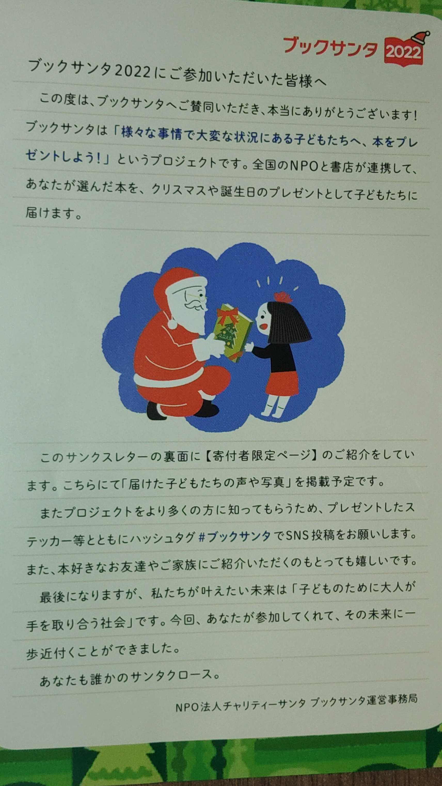 それをブックサンタで送った方がいらして、私も送りたいなと、思いました。