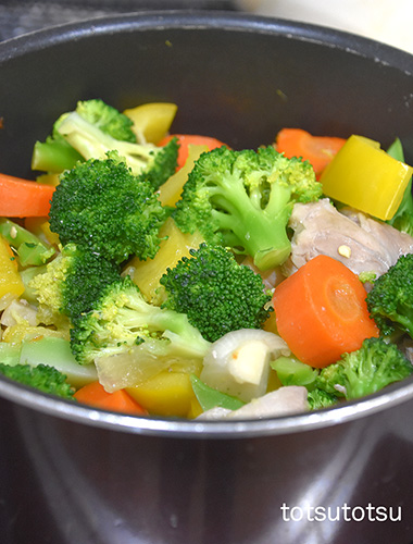 今朝の我が家の朝食は、「野菜の豚バラ蒸し」を胡麻ダレとマーマレードポン酢で。