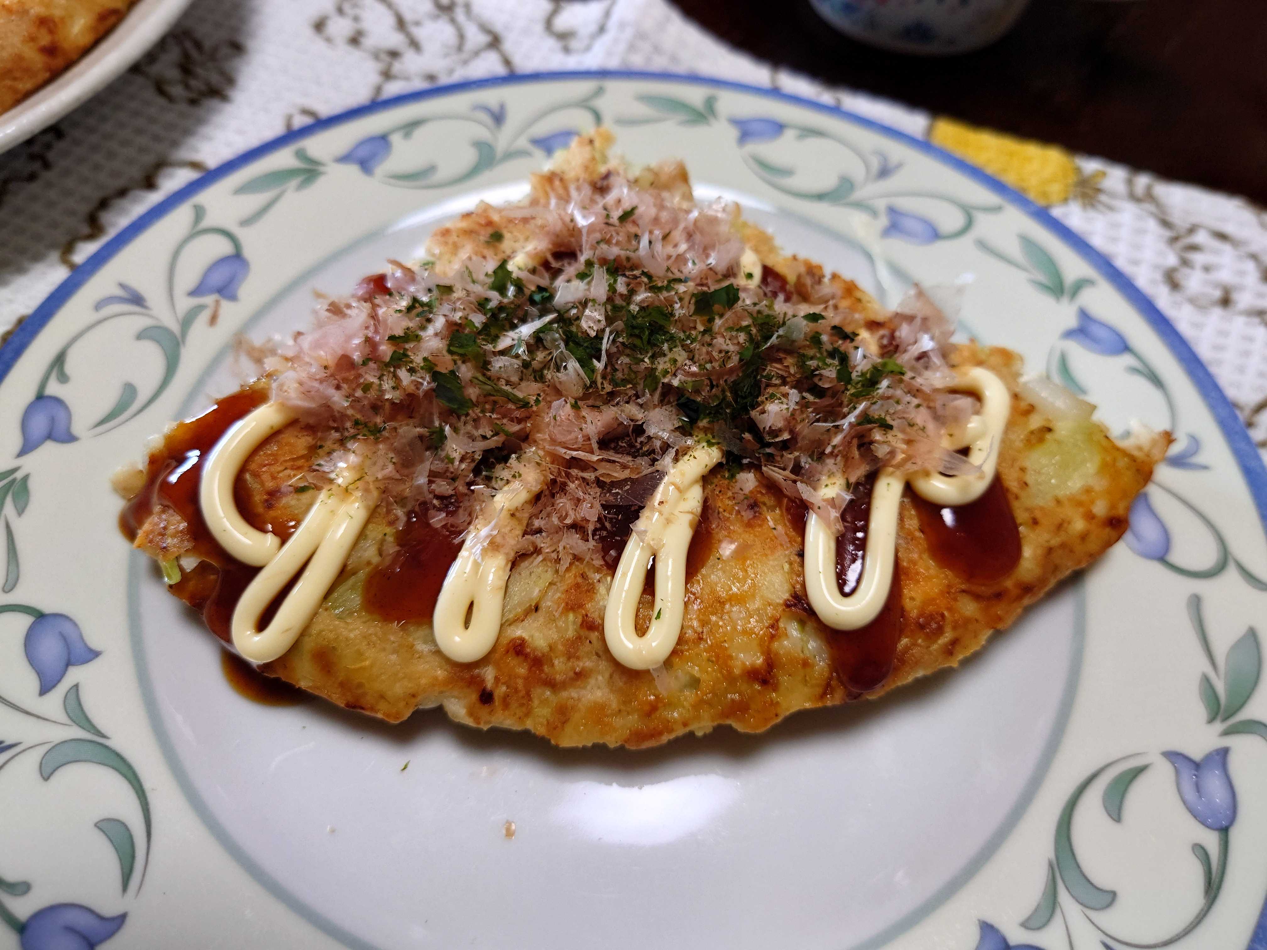 ソース、マヨネーズ、鰹節、青のりをかけたところ。