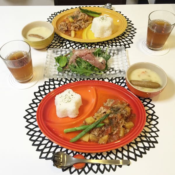 ルクルーゼマルチオーバルプレートで晩ごはんです。 豚肉とさつまいものトマト煮 クリームシチュー 生ハムサラダ ルクルーゼ (ル・クルーゼ)マルチオーバルプレート 選べるカラー (レッド・オレンジ・イエロー・グリーン・ピンク) ランチプレート ★Le Creuset【楽ギフ_包装】【楽ギフ_のし宛書】 ルクルーゼ (ル・クルーゼ)ライスボール 選べるカラー (レッド・オレンジ・ピンク)★Le Creuset【楽ギフ_包装】【楽ギフ_のし宛書】 ルクルーゼ (ル・クルーゼ) チョップスティック レスト(箸置き) 5色セット(ブルー・グリーン・イエロー・オレンジ・レッド) ★Le Creuset【楽ギフ_包装】 豚肉とさつまいものトマト煮はストウブで作りました。 ストウブの22cmは良く食べる我が家にはとても使いやすいです。 【ストウブ ピコ ココット ラウンド 22cm 鍋】【送料無料】ストウブ ピコ ココット ラウンド 22cm チェリー・グレー・ブラック・マスタード RST-47[staub ピコ・ココット 丸 鍋] 【D】◆2【楽ギフ_包装】【RCP】【ss】【予約】 無水調理ができるので蒸し煮に最適。 引越しに向けて、ルクルーゼの食器類は明日にでも箱詰めしちゃう予定なのでマルチオーバルプレートともしばらくお別れです。 また4月になったら使います。 マルチオーバルプレートはワンプレごはんが簡単にきまるのでおすすめです(●´▽`)