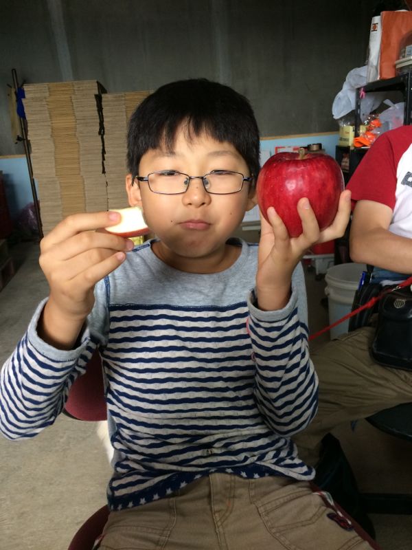 スタディファーム一日目の朝、二本松農園さんの事務所で、オーナーのお母様にご用意いただいた朝ごはんをいただきました。 息子がおにぎりを一口食べて 「うまい!」 ほうほう、どれどれ、、、 すごく美味しい。 二本松農園さんの今年の新米を井戸水で炊いたご飯は、かなりおいしく、パクパクお腹にはいってしまいました。 同じく農園でとれたきゅうりと茄子の漬物も、素晴らしい味。 こちらの農園のメインはお米ときゅうりですが、オーナーのお父様が作っている茄子は、とても立派で美味しいです。 美味しいご飯をありがたくいただき、農園できゅうりと茄子の収穫。二十日大根の種をまいて、リンゴ農家を訪問したときの画像がおちら。 すごく甘いリンゴのお腹いっぱいいただきました。