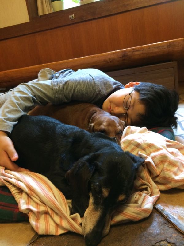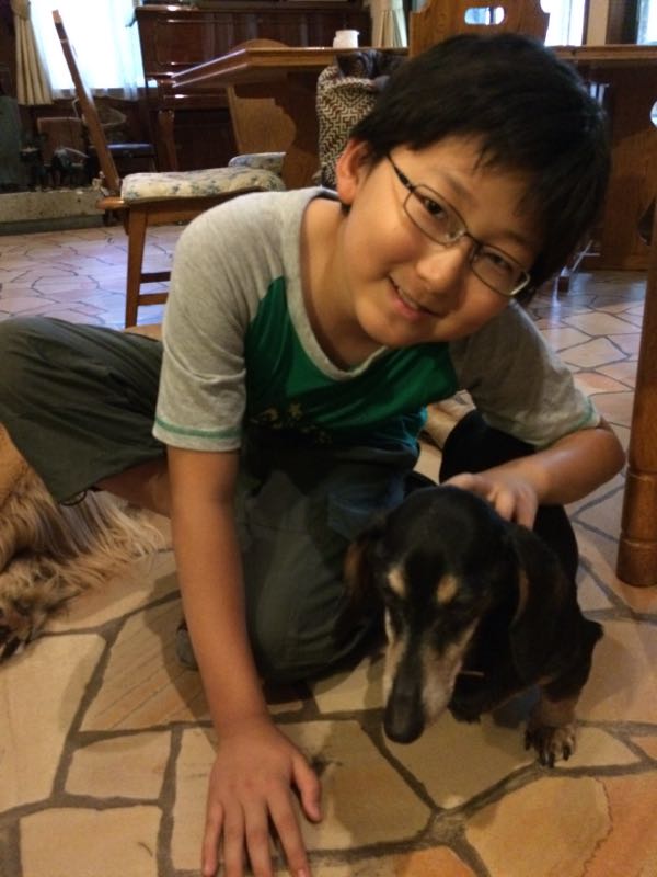 宿の先代二匹はどちらも数年前に病死して、昔からいるのはこのダックス兄弟だけ。 子供が大好きなこの二匹は王子が幼児のころから仲良しで、王子も小さい時は別れ際にはいつも泣いてました。 我が家の旅行も、最初は二本松を予定してたけど、 片道五時間はパパが無理となり、 王子がずっと会いたがっていたこの二匹に会いに来ることに。 着くなりオーナーに、 『虫が知らせたねかね』 と言われたから、どうしたのかと思ってたら 黒のダックスがガンで余命1カ月と。 生まれたときからずっと一緒だったもう一匹も とびきり元気なく、とても心配。 みんなが若くて元気だったころが懐かしいね。 我が家も今後、どうなるかわからないし、 みんな、また会えるかな、、それともこれが最後だろうか。