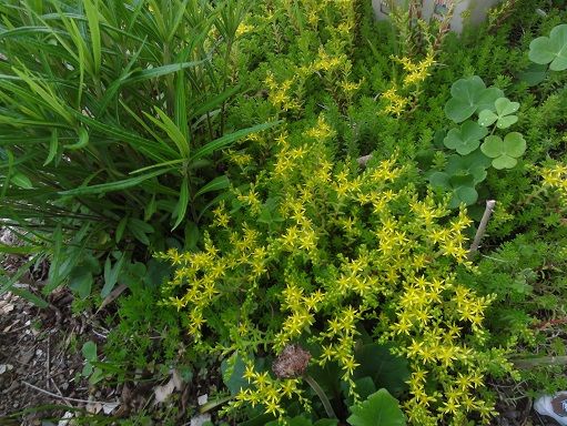 普段はコケみたいに地面を覆っているセダムの花が咲いた。