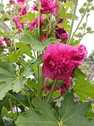 濃い色のタチアオイに別の種類(中に花びらがある)が咲いている。