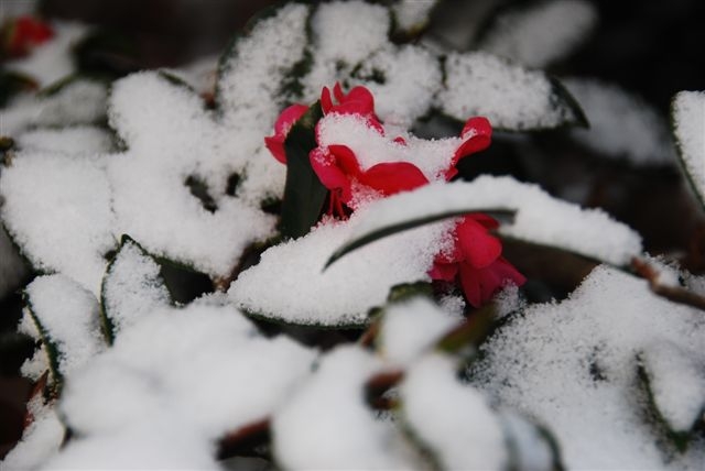 千葉にも初雪が降りました。17日朝起きたら雪が積もっていました。どうりで外が静かでした。雪が降るときって嵐でない限り、深々と降るというようになぜか静かな気配を感じます。夜中に車庫の屋根を見た時、白いなーと思ったのですが、雪かどうか確認しないで寝てしまいました。朝起きたら本当に真っ白で久しぶりに、ちょっと嬉しくなりました。 山茶花が雪のお布団に入っています。 みかん(夏みかん系?)も雪に埋れて寒そうです。 バラのつぼみが 寒さをこらえています。 松竹梅の盆栽の中の紅葉も雪をかぶっています。梅も咲きそうになりながら、ちょっと待った、になりました。この雪は一日で殆んど融けてしまいましたが庭の隅の雪は次の日までありました。温暖化のこの頃ですから寒い冬が戻ってきて、少しほっとした一日でした。