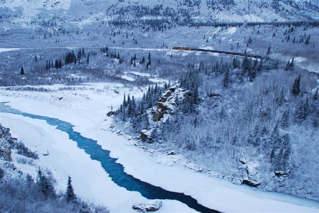 現地時間5日の夜初めてオーロラを見に行きました。ヒーリーの近くにあるデナリパーク、空があちこちと明るくなりオーロラです。見とれてしまいました。でももう少し山のほうにも行こうと場所を変えます。両側に山のあるところへ着きました。オーロラが出ています。でも風がものすごく吹いていて、寒さもすごいです。車から出てみたものの、寒くて私は出るのが嫌になってしまいました。みるのが精一杯で、写真どころではありません。カメラが壊れたらどうしようと考えると写す気になりませんでした。先生とYさんは果敢にカメラと三脚を出して撮影を始めました。でも風がすごく、体感温度はかなり低かったようです。それに手袋が飛んでしまったり、三脚が倒れたり、さんざんで、すぐ引き返してきました。初日の撮影はこんな具合で半分偵察ということで終わりました。次の日(6日)はブランチとして11時ごろもう一軒のレストランに行き、今回は少なめに注文をして何とかほどほどの食事を食べることが出来ました。その後昨日行ったところがどんなところか、もう一度行ってみようということで、連れて行ってもらいました。夜と昼では全く印象も違いなかなかいいところという印象を持ちました。温度が低いので雪質が良く、歩くとギュッギュッと言います。とある橋のところで止めてもらいしばらく撮影タイム。アラスカ鉄道の線路が見えるので列車が来たらいいねーと話していると、遠くで汽笛が聞こえます。もしかして列車が・・・と思ったら来ました。長い長い貨物列車でした。アラスカの大地に石炭や石油を積んだ列車が走っています。 それほど高い山ではなさそうですが、雪をかぶって真っ白です。雪がついて凍りついたような木々、暖かくても-7~10℃、寒いと-30℃にはなるようです。積雪はまだ?少なく犬ぞり隊はこの近くでは走れないので、もっと雪の多いところへ移動しているそうで、楽しみにしていた人は残念がっていました。昼間の撮影を終わり、夕食まで休憩、そして夜7時に夕食を済ませ、10時過ぎから撮影です。