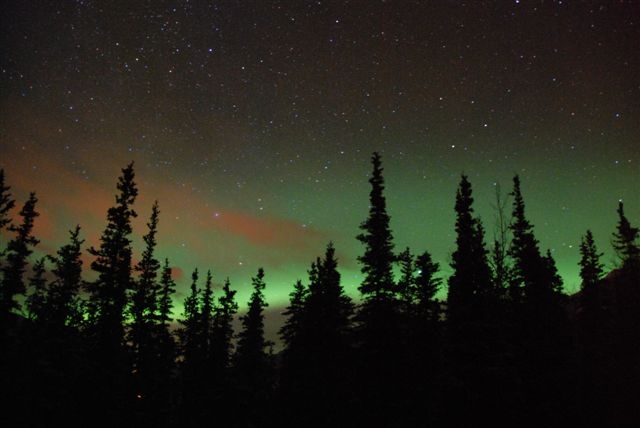 オーロラを見るだけでなく、写真を撮るのが目的の我々は、絵になるところでオーロラの出現を待ちたいと、車を移動してもらい、オーロラハンターです。デナリパークに行きオーロラを待ちました。出てきました。辺りが明るくなります。車の光かなと思ったのですが、案内してくれた方が、「オーロラです」といってくれました。 実際の色はもう少し白っぽいのですが、出ました。満天の星も見えます。晴れてよかった。 山の上に出るオーロラも・・・・・オーロラはデジカメで20秒くらいかけないと写らないので、動いているのをきれいに撮れるときと、駄目な時があります。 帯のようでもあり、カーテンのようなオーロラ、なんとか撮れました。見えたように撮るのはなかなか難しいです。 強くオーロラが出ている時は、良く撮れます。ちょっとカーテンのように写りました。左下の赤い林は小学校があるそうで、夜中もどういうわけか照明されていました。 最後の日はこのロッジを夜だけ借りて、体を温めながら、明け方まで撮影しました。空にはオリオン座が輝いていました。 オーロラが縦の筋になったり、横に広がったりつい見とれてしまいました。足は冷たく凍えそうになっていましたが、見ているとそれも忘れました。 今回は写真家のK氏ご夫妻が同行してくださいましたので、とても有意義な旅になりました。写真も見せてくださいましたし、いろいろな写真の撮り方も質問でき、本当にありがとうございました。また行くことができるかな?