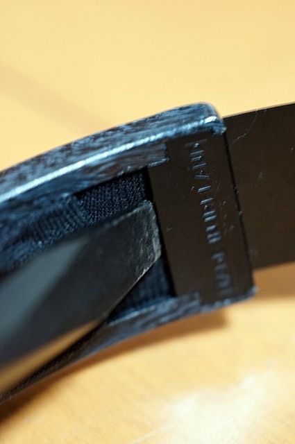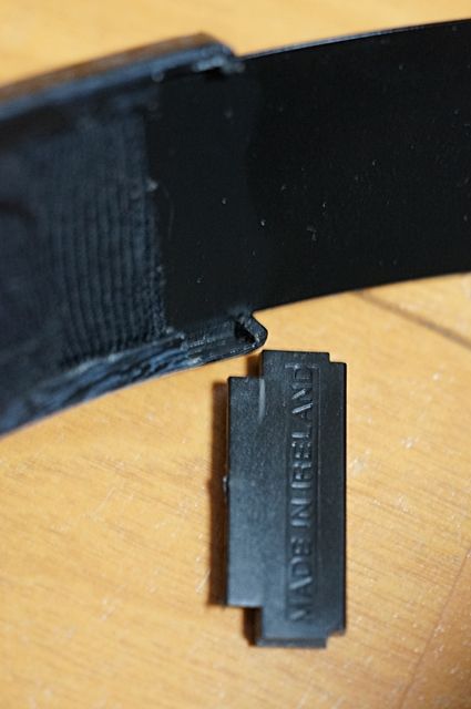 まずはバンドの端にある「made in irelamd」と表記されてるプラスチックの止め板。これを取り外す。方法はマイナスドライバーを差し込んでくぎ抜きの要領で「エイヤ」と外す。折れるんじゃないかと不安になるが、これしか方法はないみたいね。思ったよりソフトな素材で、割れるより躊躇してゆっくりやってもプラスチックに変な曲がりや折り目がつく可能性もあるから気合と度胸あるのみ。パカっと外れます。