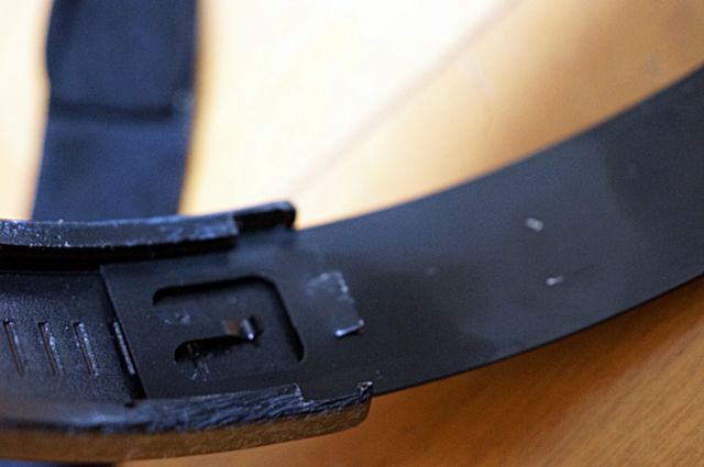 新しいパッドをガイドレールに沿って滑り込ませるのですが、ここで少しだけ注意。ヘッドバンドは目いっぱい伸ばした状態にしておきましょう。良く見ると金属板に四角く出ている部分があります。バンドを目いっぱい伸ばしておかないと、この出っ張りが邪魔してパッドが入っていきません。最初は良く見えなくて「何で入らないんだろ」と悪戦苦闘してしまった。